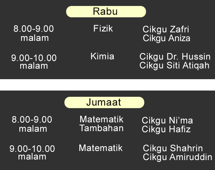 Bukan tutor biasa. Tenaga pengajar terdiri daripada Guru Sekolah , Ketua Panitia , Guru Pakar Subjek , Pensyarah Universiti
